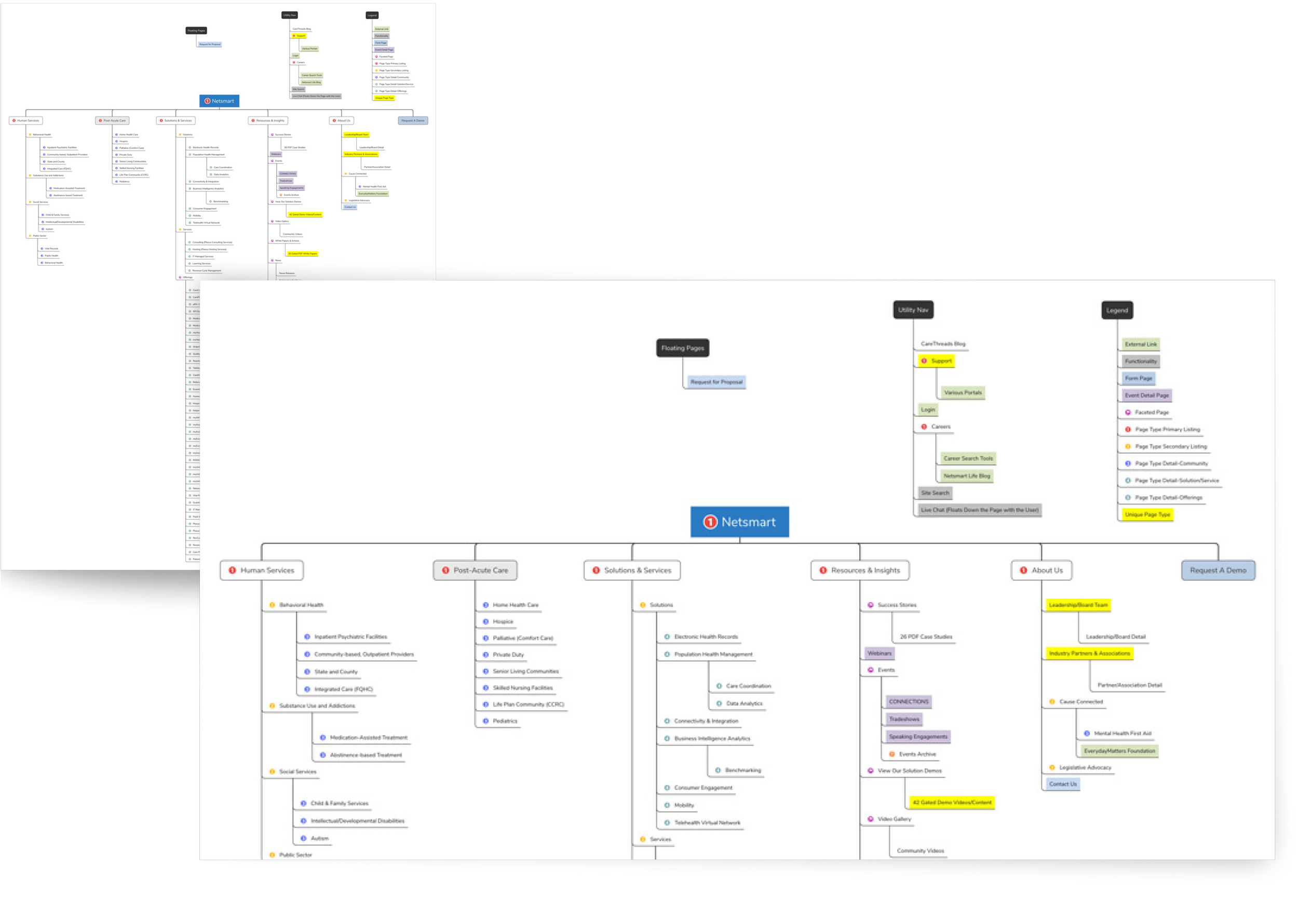 The newly updated Netsmart site reflects the company's updated brand styles, voice, and messaging; fairly incorporates both primary divisions; has intuitive navigation and content structure; caters to the various personas within each division; and puts information and resources at the end user’s fingertips. To complement the robust faceted search functionality for products, documentation, services, and educational information, my team implemented two-way relationships between these content types, enabling Netsmart admins to easily add, update, and remove content without having to edit multiple sections of the site. The site is now fully responsive and SEO-friendly, features an organized, intuitive user flow, and caters to the company's various clientele and divisions.