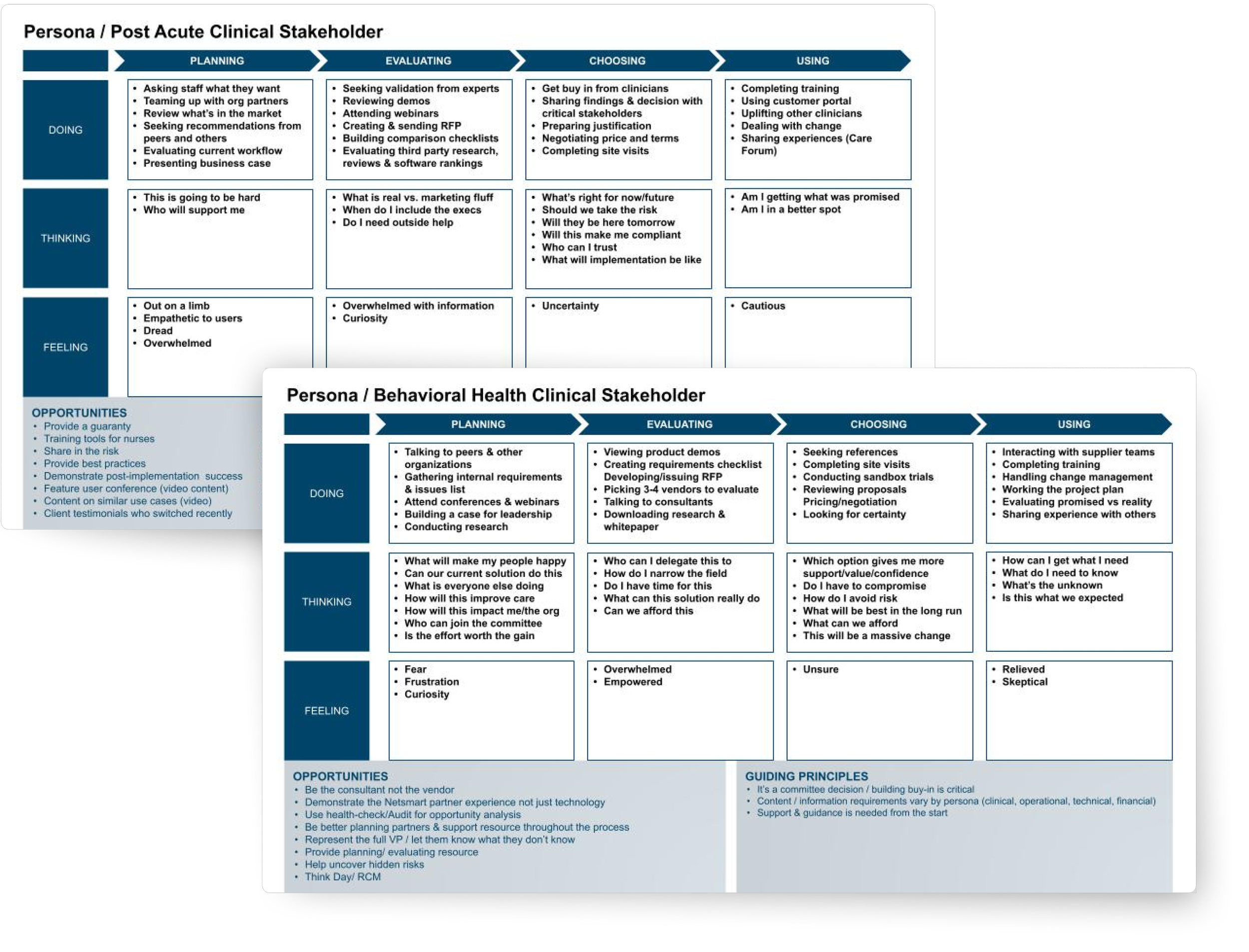 Gathered representatives from the two client divisions (human services and post-acute care) for a full-day persona development study. Based on these personas, the team created an intuitive journey map for the entire site, divided into the two primary divisions, and developed a comprehensive content definition and relationship document.